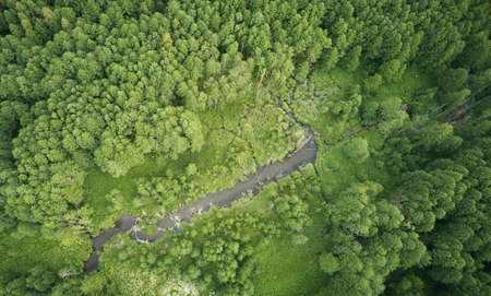 Flying above green forest and river in summer. Aerial view of wildlife in Poland, Europe