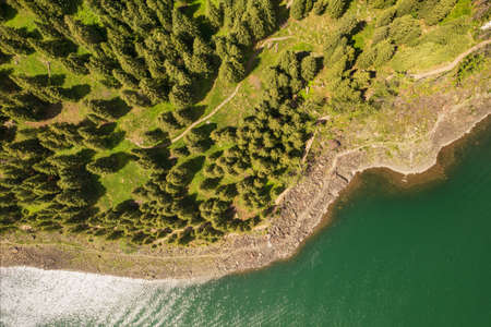 Mountain lake with blue water. Trunks of fir trees are in a mountain lake. Drone footage, top view. Coniferous trees. Kazakhstan, Almaty, Kaindy lake.