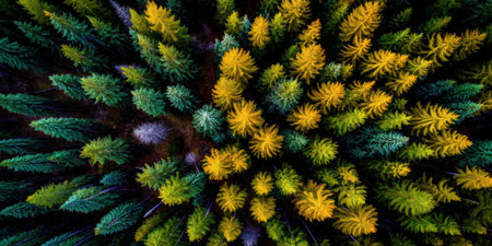 This stunning aerial view captures a vibrant mix of evergreen and yellow pine trees, showcasing the beauty of a natural forest landscape, ideal for ecological themes.