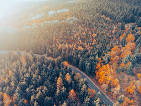Aerial view of dark mixed pine and lush forest with green and yellow trees canopies in autumn mountain woods