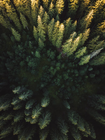 An atmospheric top down aerial view of a dense dark green forest. The moody lighting highlights the texture of the treetops creating a mysterious natural pattern.