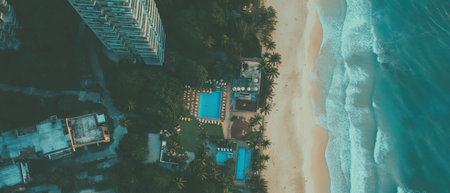 Breathtaking aerial view of a serene beach resort with sparkling pools and sandy shores