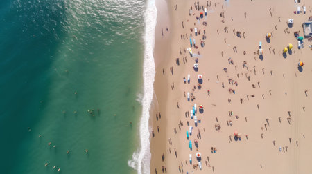 Generative AI : Aerial view of people with a surfboard in the Ocean waters Australia
