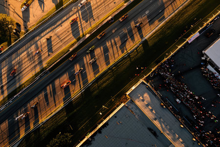 City traffic at sunset. Busy street in the city center. Cars cross the intersection. The camera looks down from a birds eye view. Drone footage.