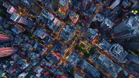 Capture the breathtaking beauty of an urban sunrise from above in a stunning photograph From the lofty perspective of a drone reveal the mesmerizing interplay of light and shadow over a sprawling cityscape Skyscrapers stand tall their architectural details enhanced by the golden hues of the awakening sun