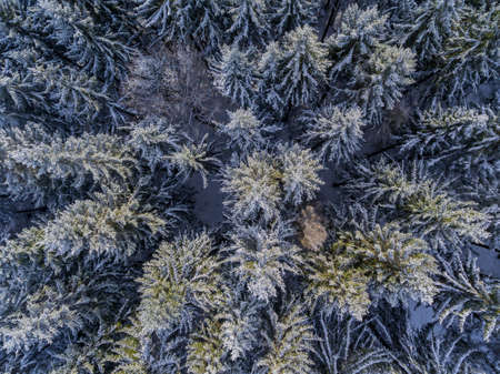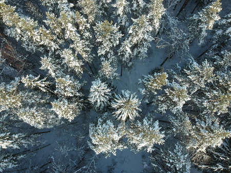Aerial view of winter pine forest covered with hoarfrost.