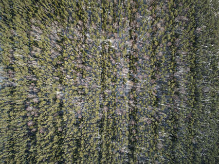 Aerial view at the winter forest. Pine trees as a background. Winter landscape from air. Natural forest background. Forest background from drone