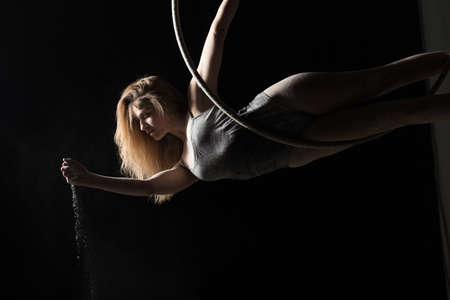 Aerial acrobat in the air ring. Young woman performs the acrobatic elements in the air hoop. Aerialist in on black background dark studio with backlight and smoke. For sports, acrobatic, circus school