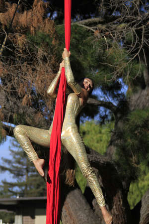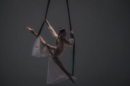 Female athletic, sexy and flexible aerial circus artist with redhead dancing in the air on the silk