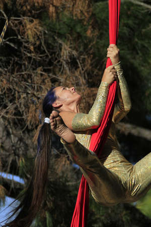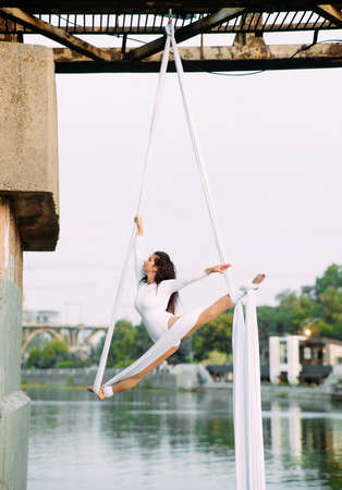 Aerial acrobat in the ring. A young girl performs the acrobatic elements in the air ring.