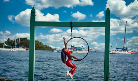 A young girl in a red suit performs acrobatic elements on an aerial hoop near the sea.