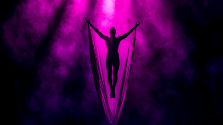 Silhouette of a woman acrobat during a show on canvases in the air.