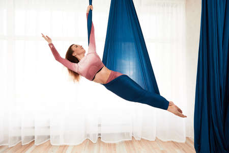 Tender fit young woman doing fly yoga stretching with hammock in yoga studio.