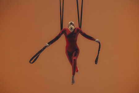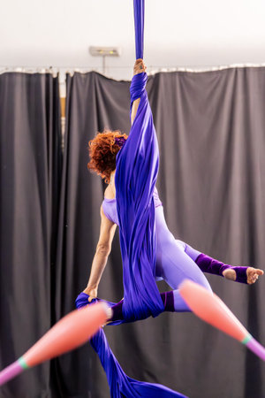 Graceful aerialist performing a captivating aerial dance routine, showcasing strength, flexibility, and artistry with flowing silk fabric and indian clubs