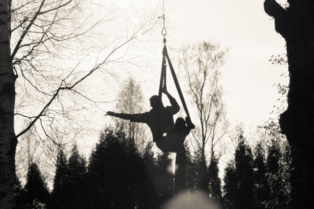 Sport exercises with aerial silk outdoor - in the park or in the yard