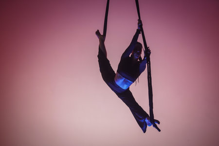An acrobatic girl demonstrates stretching in twine on an acrobatic trapeze. Acrobatic athlete performing acrobatic stunts at height in studio with pink light.