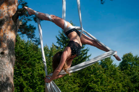 A slender girl with blonde hair, in a black stage costume, performs gymnastic and circus exercises on white silk against the background of the forest and the sky. Shooting on the street.