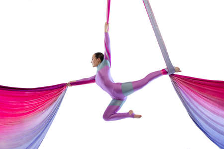 High fly. Portrait of young woman, air gymnast training, performing isolated over white studio background. Colorful fabric. Concept of sport, action, lifestyle, beauty, hobby. Copy space for ad