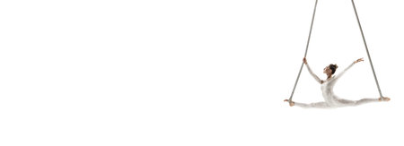 Bird, flyer. Young female acrobat, circus athlete isolated on white studio background. Training perfect balanced in flight, rhythmic gymnastics artist practicing with equipment. Grace in performance.