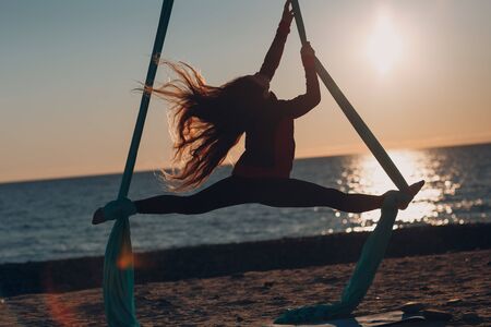 Air yoga on the beach. Woman health. Split on hammock.