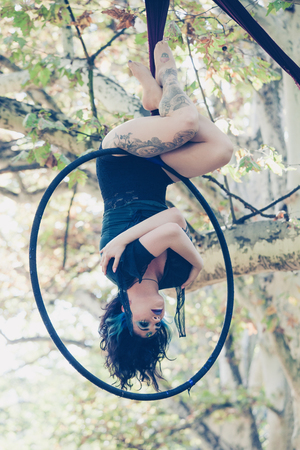 young woman aerial hoop dance in forest