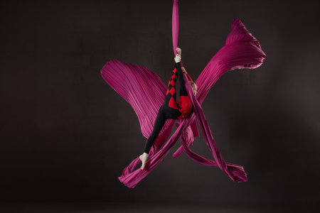 Female circus gymnast hanging upside down on aerial silk and demonstrates stretching. Woman performs tricks at height on red silk fabric. Difficult acrobatic stunts on black background with backlight.