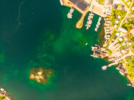 Top down view, Sea fjord shore at Reine village. Lofoten islands North Norway. Travel destination.