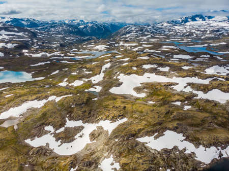 Summer mountains landscape in Norway. National tourist scenic route 55 Sognefjellet. Aerial view