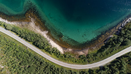 Cinematic top down view of car driving along scenic coastal road in Norway