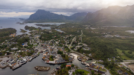 Aerial view of Henningsvaer fishing village on Lofoten islands in Norway