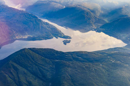 View from airplane to Norwegian fjords landscape. Aircraft flying over Norway Scandinavia.