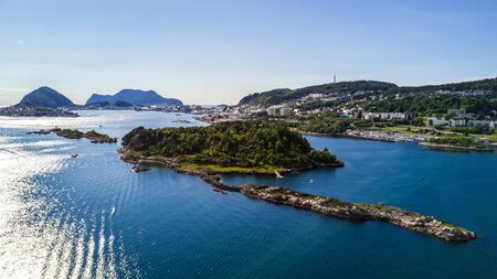 Norway Karmoy island drone view. Akrehamn town aerial view.