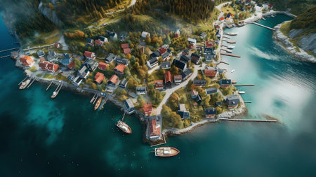 Generative AI : Aerial view of a little town in a fjord on the Lofoten Islands at sunrise Nusfjord Norway