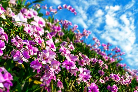 Beautiful bloom pink purple orchid flower garden, blue sky and clouds, fresh summer season, tilt shift blur effect