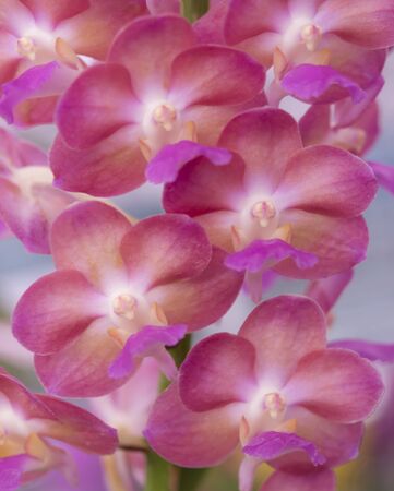 Close-up of Ascocenda pink orchid bouquet. The flowers are brightly colored. (Hybrid orchid between Ascocentrum and Vanda)