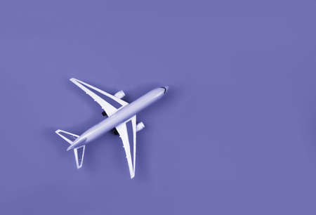 Travel minimal background. Model airplane in flight on an empty colored background. Copy space
