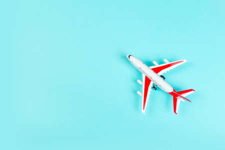 Model plane,airplane on blue pastel color background with copy space.Flat lay design.Travel concept on blue background. top view