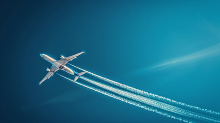 Experience the freedom of flight as a sleek jetliner cruises through the endless expanse of a deep blue sky, leaving a trail of white contrails. Evokes travel, adventure, and global connection.