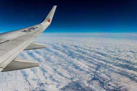 Voronezh, Russia - March 5, 2018: view at snowy fields, unusual clouds, and plane wing from airplane of Rossiya airlines