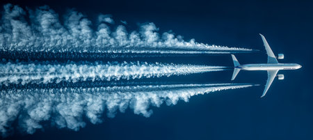 Passenger Airplane Flying High, Leaving a Long White Contrail Against a Deep Blue Sky