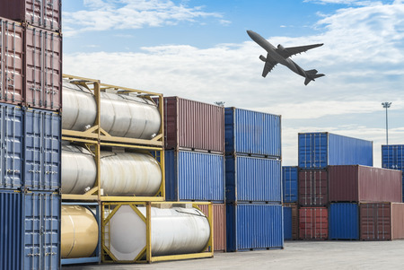 Cargo container for overseas shipping in shipyard with airplane in the sky . Logistics supply chain management and international goods export concept .