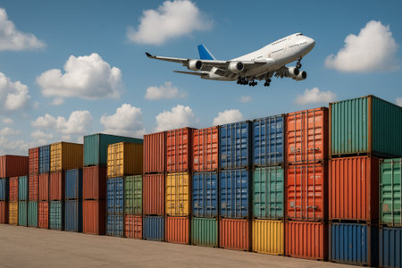 A large cargo plane approaches the landing strip, flying above stacks of brightly colored shipping containers. This bustling port scene captures both air and sea transport in action.