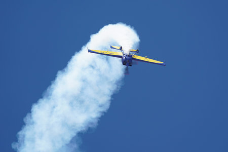 Maribor Airshow Slovenia AUGUST, 15, 2021 Aerobatic plane performs extreme maneuvers during an airshow. MX Aircraft MXS by Veres Zoltan