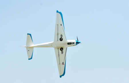 Small retro airplane, light aircraft flying in blue cloudy sky and doing stunts at Air Show. Performance, extreme, aerobatic and sport concept