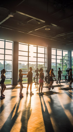 illustration of group of happy fitness girl 20 years old during a group fitness class in the gym with Generative AI