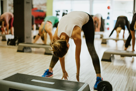 Fitness, sports, training, gym and lifestyle concept - a group of women working with steppers in the gym.