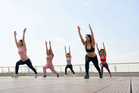 Fitness, sport, friendship and healthy lifestyle concept. Group of happy people exercising outdoor.