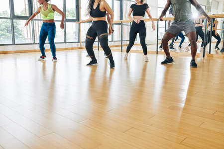 Side view of multiethnic zumba dancers with hands in air practicing zumba in dance studio