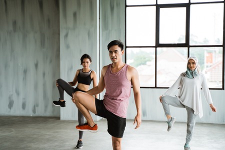Group of diverse young people in sportswear doing stretching exercises together at the gym