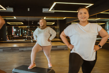 asian group friends working out or exercise and wearing sportswear in fitness or gym center, strength sporty and weight loss concept